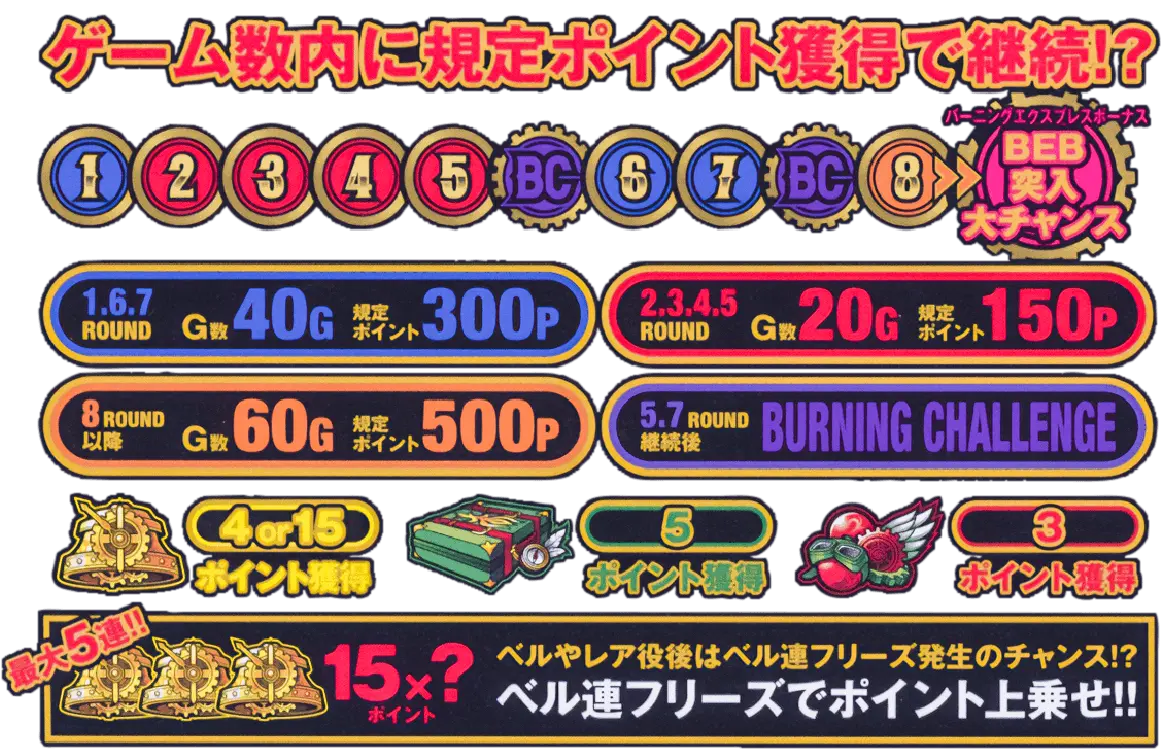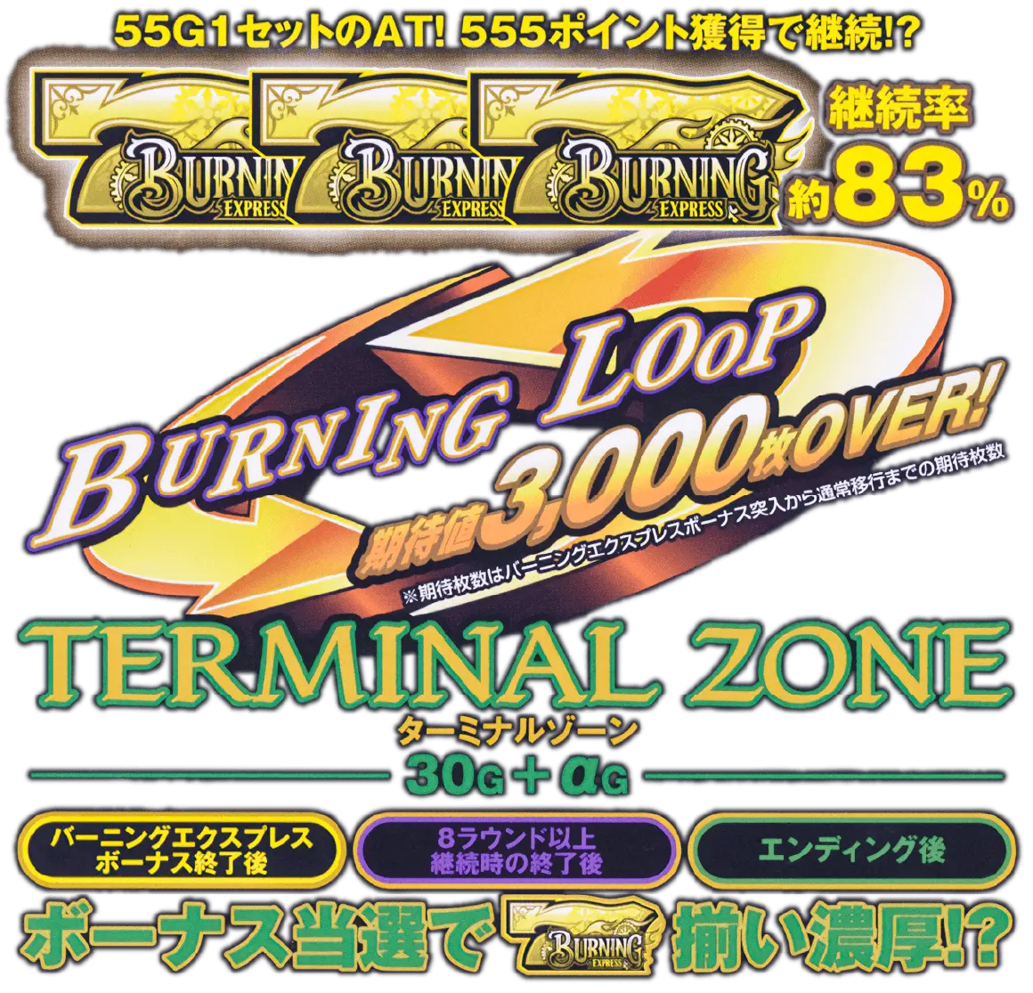 ターミナルゾーンでは、ボーナス確率が約5倍アップ。ゾーン滞在中にボーナス当選すれば必ずバーニングエクスプレスボーナス!?